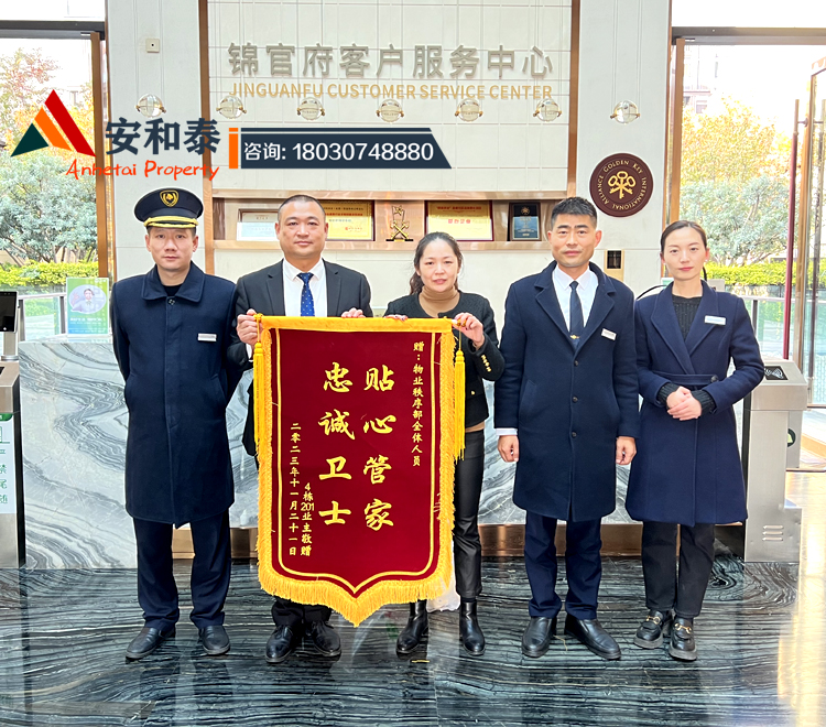 2023年11月22日下午驻新希望集团旗下锦官府项目业主赠与安和泰保安顾问团队锦旗《忠诚卫士、贴心管家》;锦官府项目是2023成都首批获得国际金钥匙联盟授牌的高端服务小区,以新希望服务理念为指导